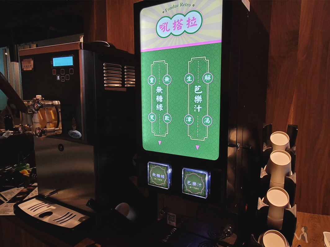 ▲セルフサービスバーのドリンクには、無糖緑茶、グアバジュース、氷水が含まれます。